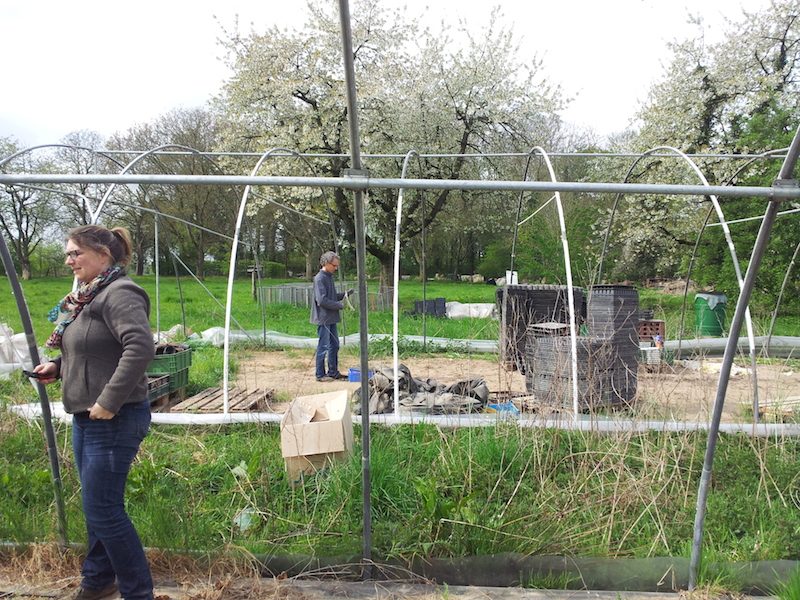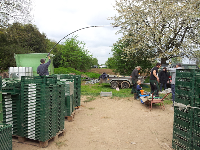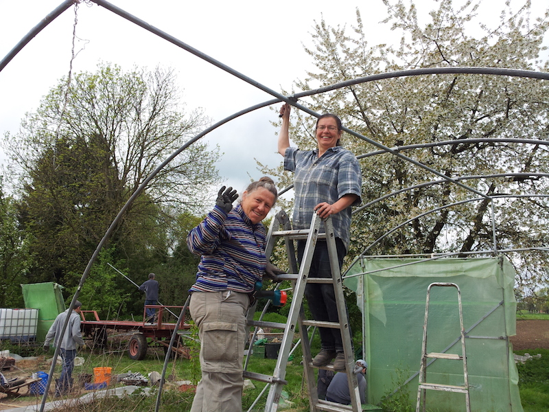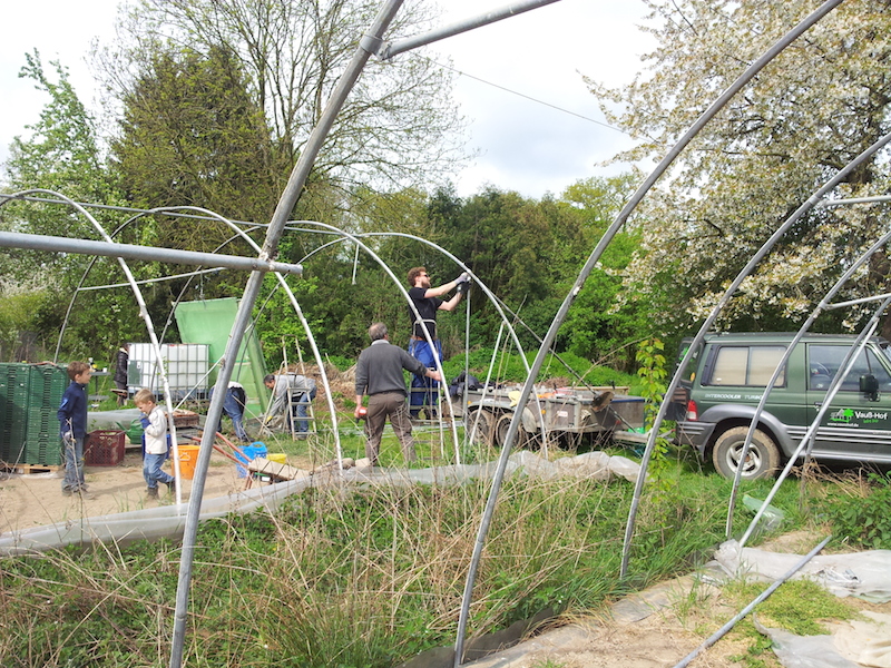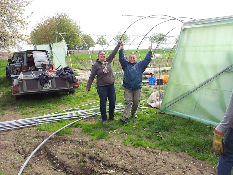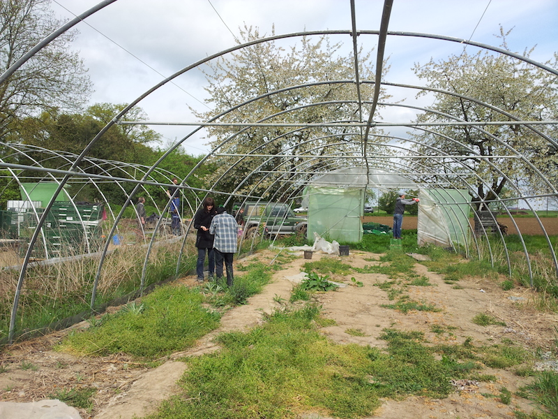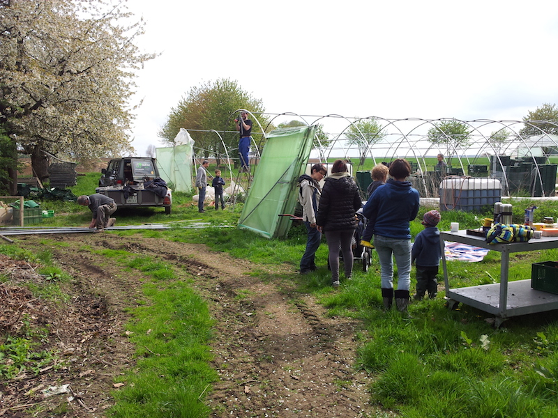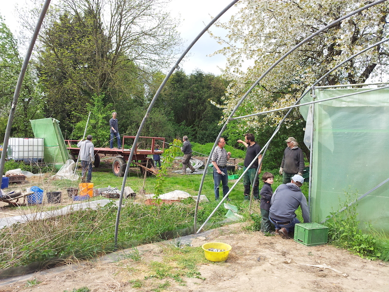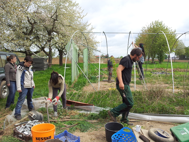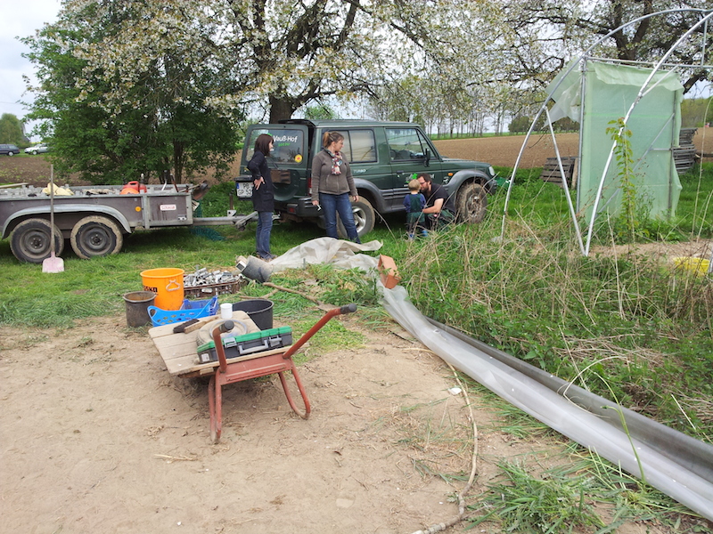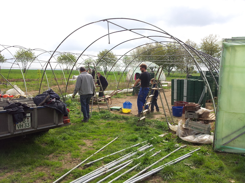 Bei sonnig bis bewölktem Wetter halfen 22 Erwachsene und 8 Kinder beim Abbau von zwei großen Folientunneln samt Bewässerungssystem, dem Verladen von Sandsäcken, Folien, Netzen, Schubkarren und Pikierkästen – die allesamt von der solidarischen Hofgemeinschaft angekauft wurden.