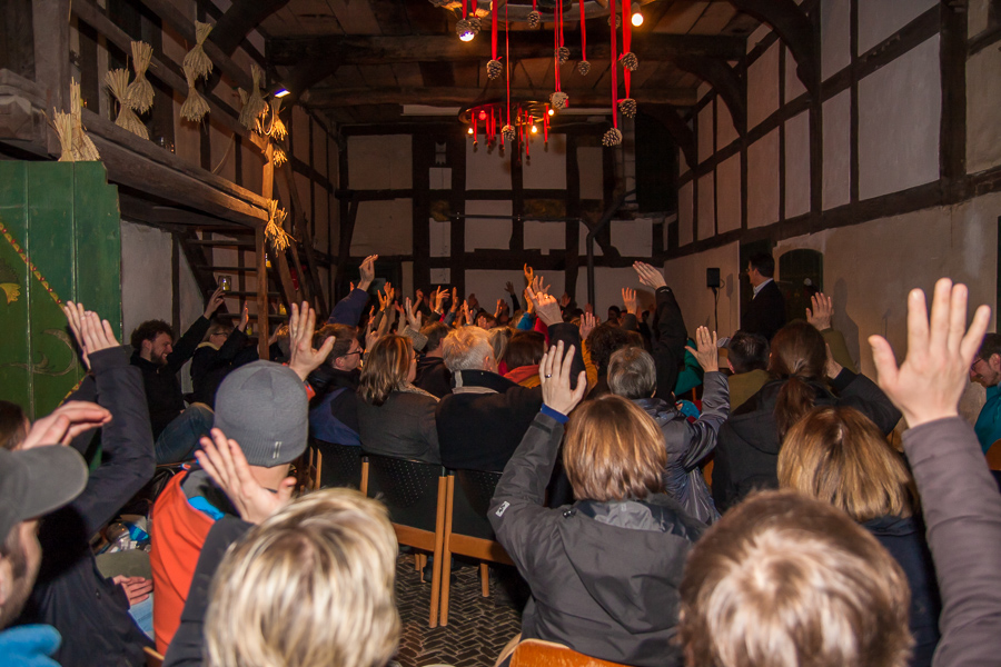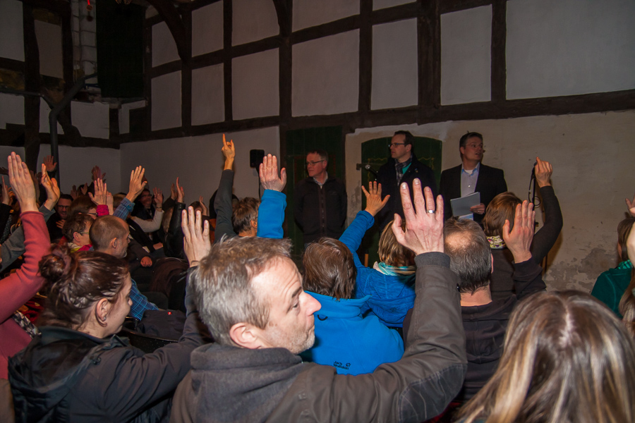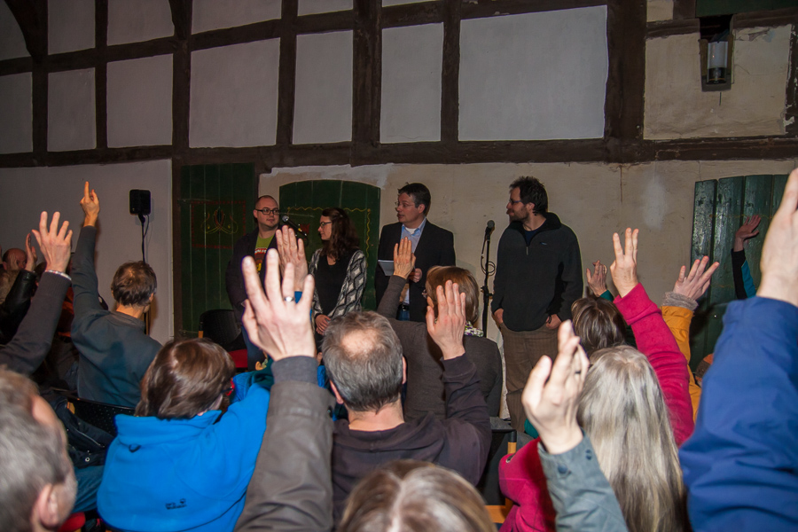 Schließlich konnte der Vorstand das Ergebnis verkünden: Die Solidarische Landwirtschaft Vauß-Hof eG startet mit einem Etat von ca. 4250 Euro pro Monat in das erste Geschäftsjahr. 81 Ernteanteile wurden an die 102 Mitglieder vergeben – und diese schmieden bereits weitere Pläne: Der Salzkottener Imker Matthias Oriwall wird zwei Bienenvölker auf den Streuobstwiesen ansiedeln, sobald dort ein Bienenheim gerichtet ist, und auch der Bau eines Storchennestes ist geplant.