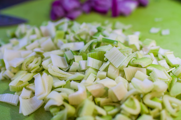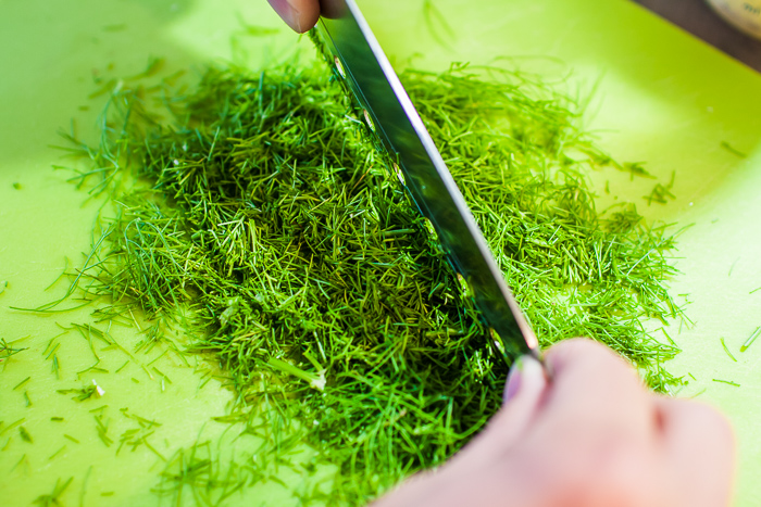 2. Von den Fenchelknollen braune Stellen und Blätter entfernen. Wurzelenden gerade schneiden. Die Knollen waschen, abtropfen lassen, halbieren und in Würfel schneiden. Das Grün klein hacken und zur Seite stellen.