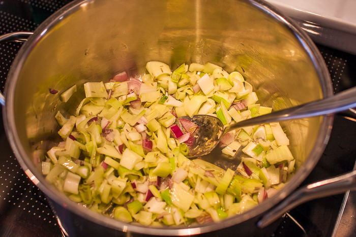 5. Butter in einem Topf zerlassen. Rosmarin, Fenchel- und Zwiebelwürfel darin etwa 3 Minuten unter Rühren andünsten. Mit Salz und Pfeffer würzen.