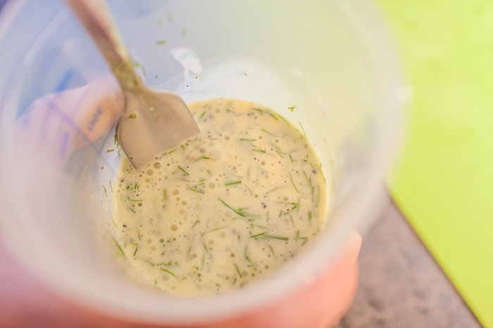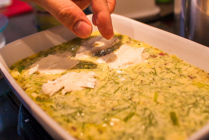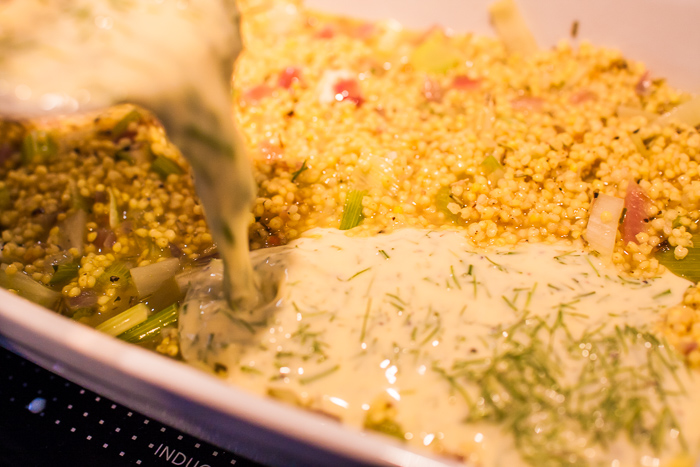 7. Eier mit Sahne verschlagen, mit Salz und Pfeffer würzen und Fenchelgrün dazugeben. Hirse-Fenchel-Masse in eine große Auflaufform geben.