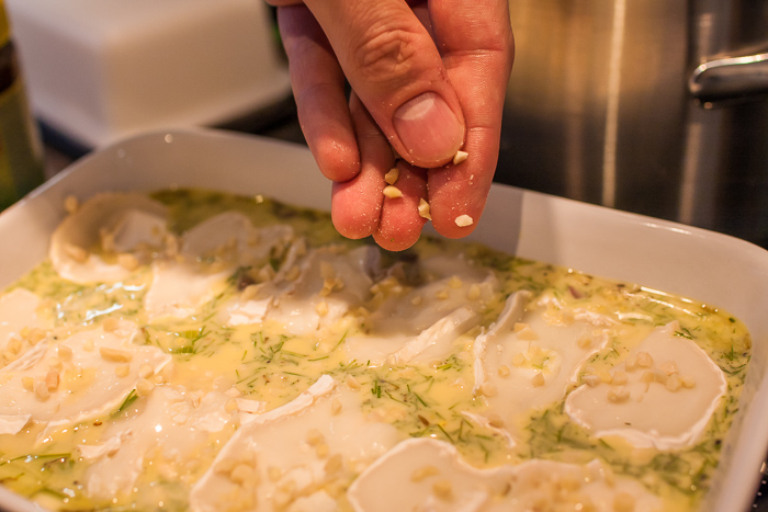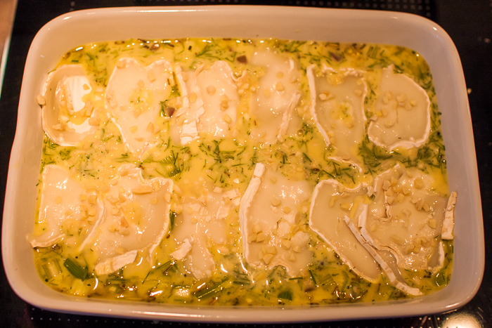 8. Eiersahne darauf verteilen. Ich finde durchmischen besser, sonst gelangt nix bis nach unten und der Auflauf ist unten dann so trocken. Käserolle in Scheiben schneiden und drauflegen. Oder Frischkäse in Flocken darauf verteilen. Haselnusskerne hacken und auf den Käse streuen.