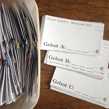 Am Sonntag, den 30. Oktober fand die Bieterrunde der SoLawi Vauß-Hof eG statt. Schon nach der zweiten Runde waren die Gebote hoch genug, um das Anbaujahr 2017 zu finanzieren. Insgesamt wurden 77 Ernteanteile gezeichnet, es sind also noch 3 Anteile für weitere Interessenten verfügbar. Nach der Bieterrunde gab es bei sonnig-herbstlichem Wetter leckere selbstgebackene Waffeln auf dem Hof.